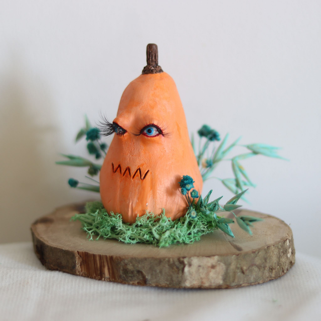 Jeanne mesure environ 12.5cm de long pour 8.5cm de large (taille du rondin). La hauteur est d'un peu moins de 10.5 cm (du bas du socle jusqu'à la tige de la courge).
