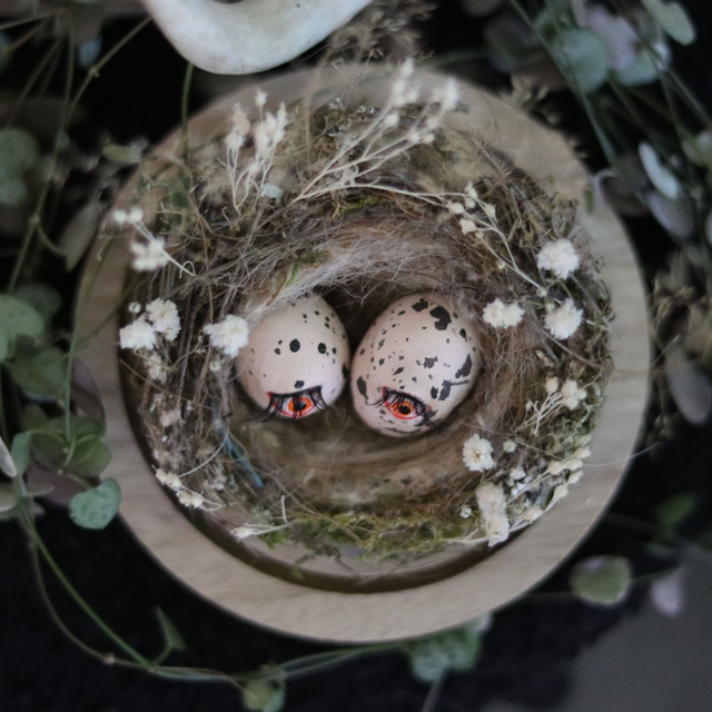 Simon et Samuel, les oeufs enchantés dans leur nid d'oiseau véritable sous cloche